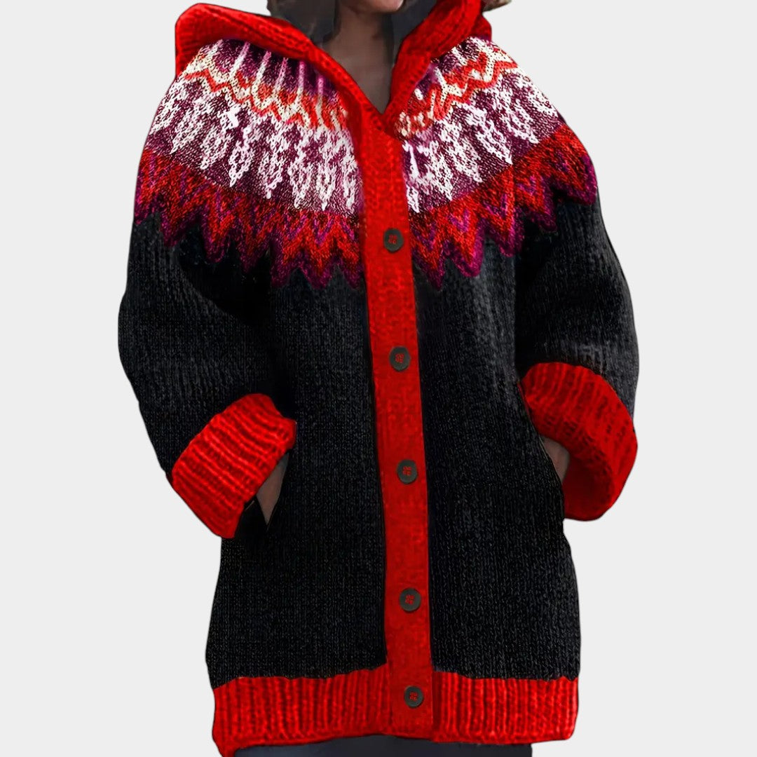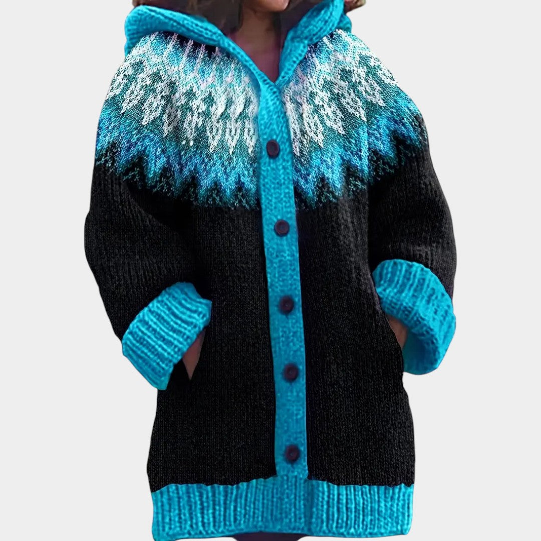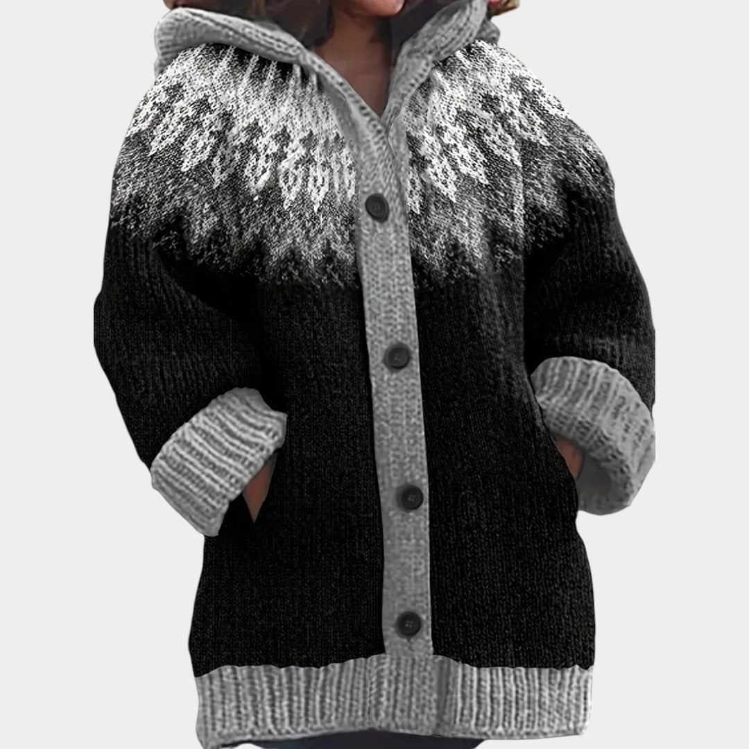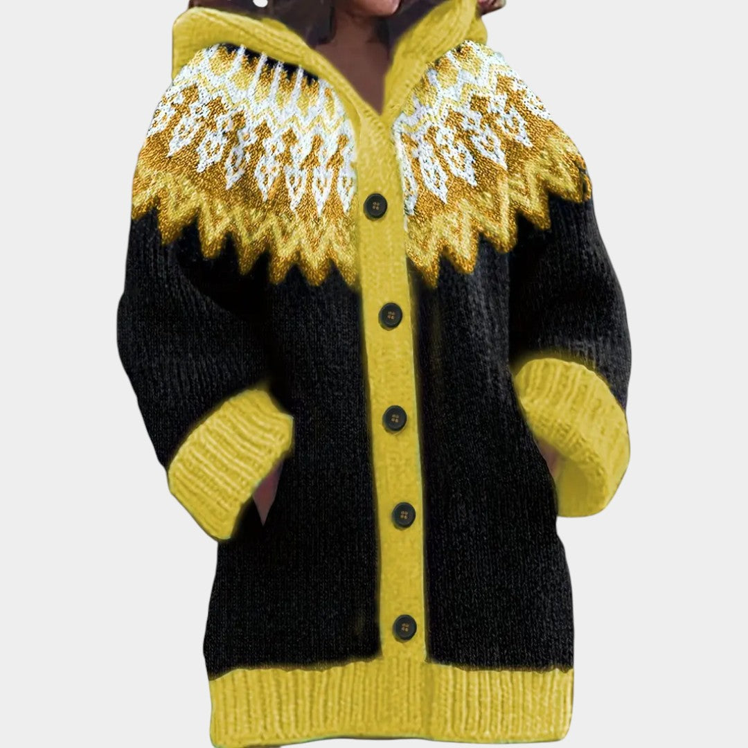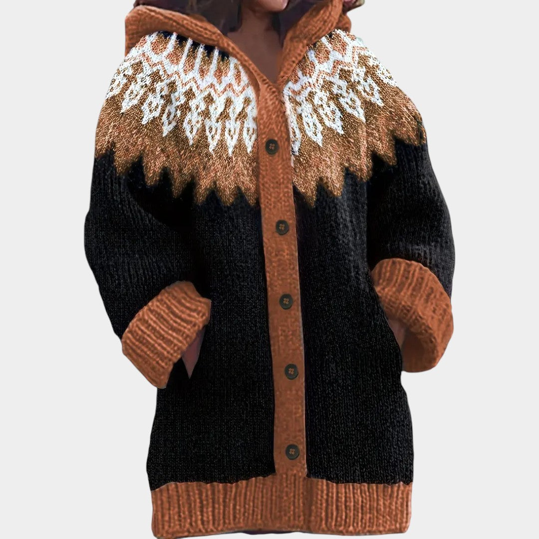 Kardigan Klára spojuje pohodlí a styl. Je ušitý z měkkého, prodyšného úpletu, má volný střih, kapuci a výrazný vzor, který dodá outfitu originalitu.