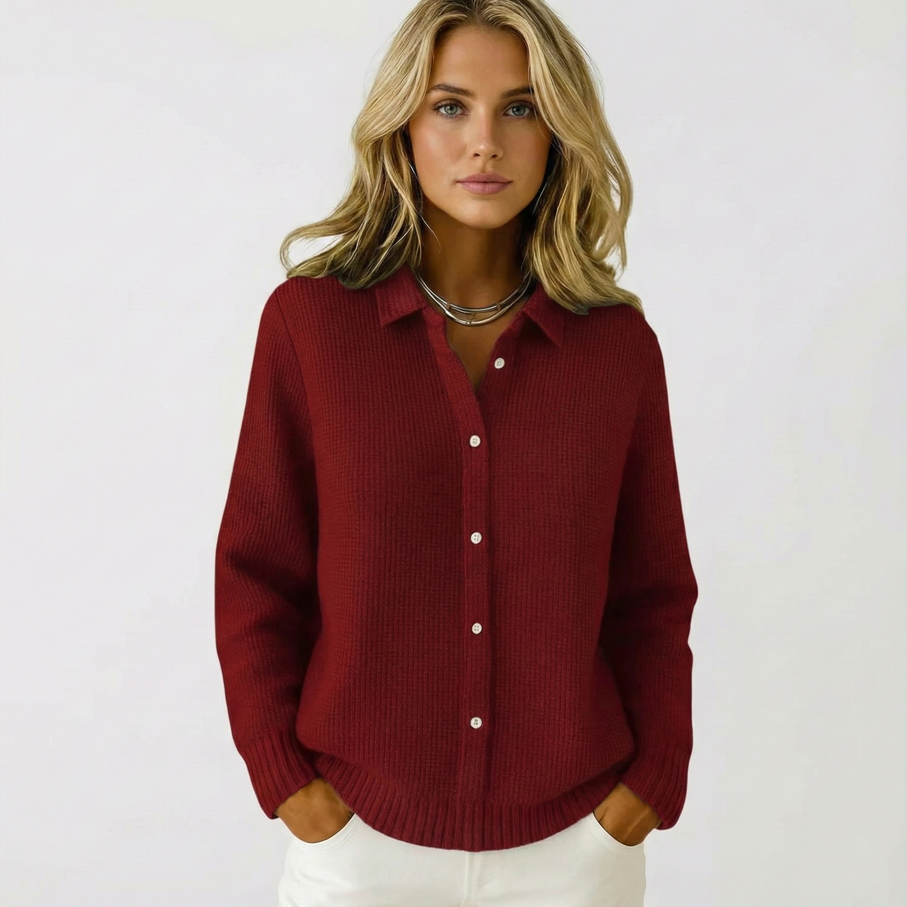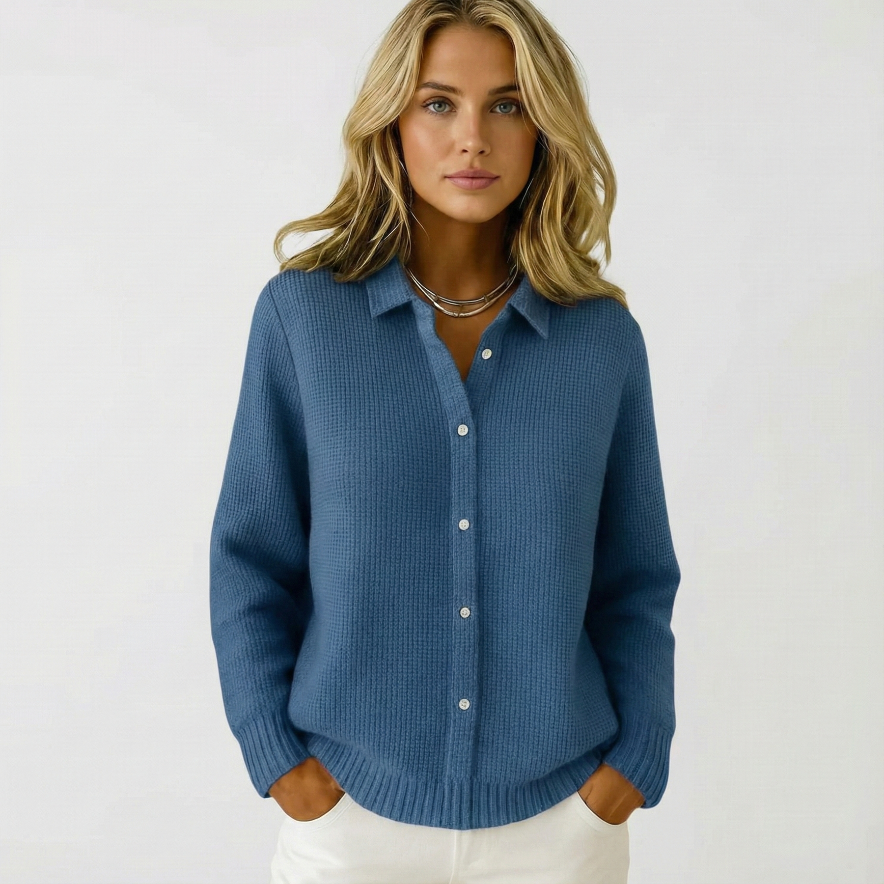 Pletená Livia vesta je vyrobena z pohodlné směsi vlny, která je teplá, aniž by byla těžká. Límec a plné zapínání na knoflíky dodávají modelu upravený, nadčasový vzhled. Jemná pletená struktura vytváří klidný, elegantní vzhled, zatímco žebrované lemy na rukávech a spodním okraji udržují vestu pěkně ve tvaru. Střih je lehce volný, což zajišťuje pohodlné nošení.