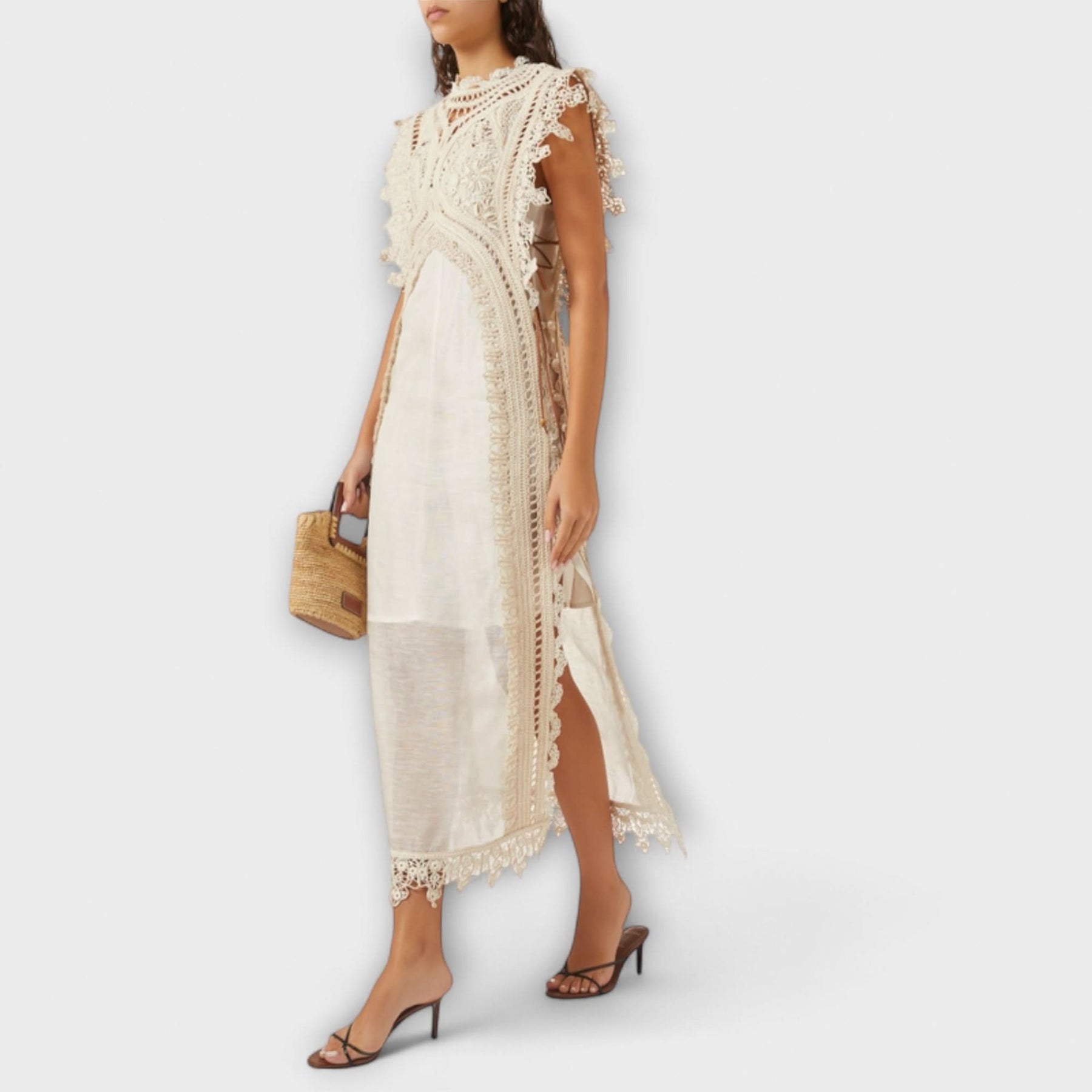 Tyto ohromující otevřené organzové maxi šaty jsou navrženy pro ty, kteří ocení eleganci a řemeslné zpracování. Vyrobeny z vysoce kvalitní polyesterové-bavlněné směsi, tyto krémové šaty mají okouzlující poloprůhledný vzor s výřezy a nádherně ručně šité okraje, což zajišťuje jedinečný vzhled, který vyniká.