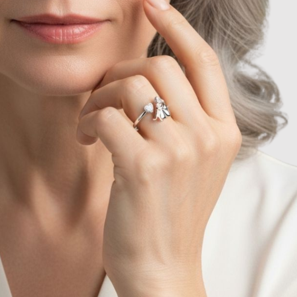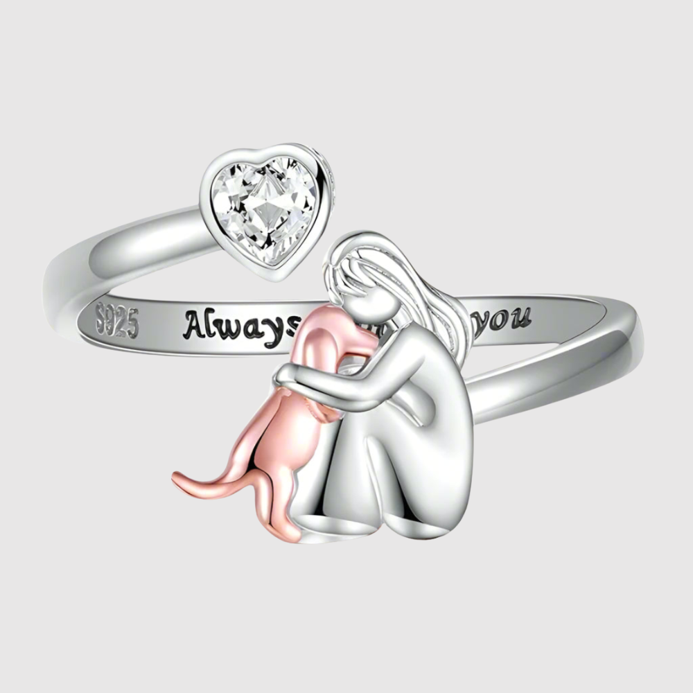 Tento jemný prsten s motivem dívky objímající psa a kočku je symbolem věrnosti, lásky a nezlomného pouta. Elegantní srdíčkový detail dodává designu hloubku – ideální pro všechny, kteří nosí své mazlíčky ve svém srdci.